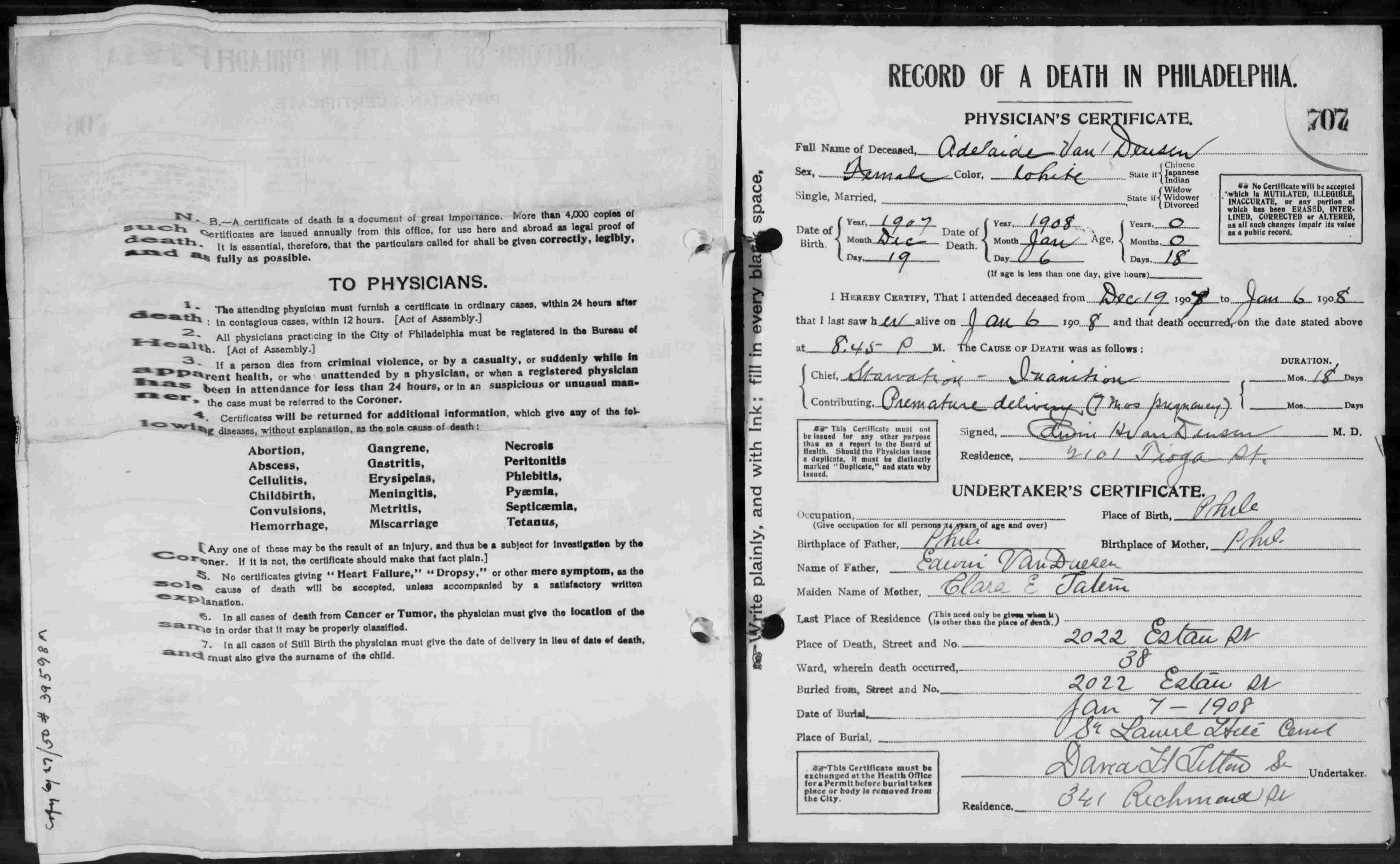 Adelaide Van Deusen - Philadelphia Death Record