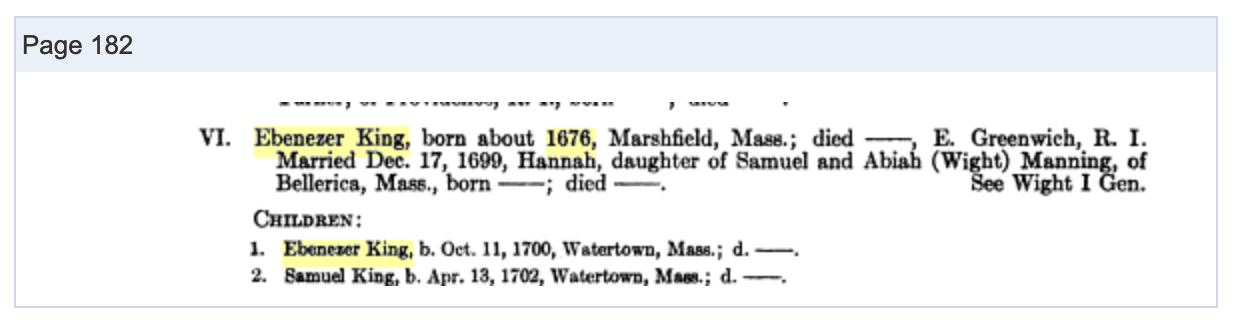 Ebenezer King, born about 1676, Marshfield, Mass.: died ____, E. Greenwich, R.I. Married Dec 17, 1699, Hannah, daughter of Samuel and Abiah (Wight) Manning of Billerica, Mass., born ____; died ____;