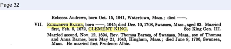 Elizabeth Baker & Clement King - Some Ancestral Lines: Being a Record of Some of the Ancestors of Guilford Solon Tingley and His Wife, Martha Pamelia Meyers