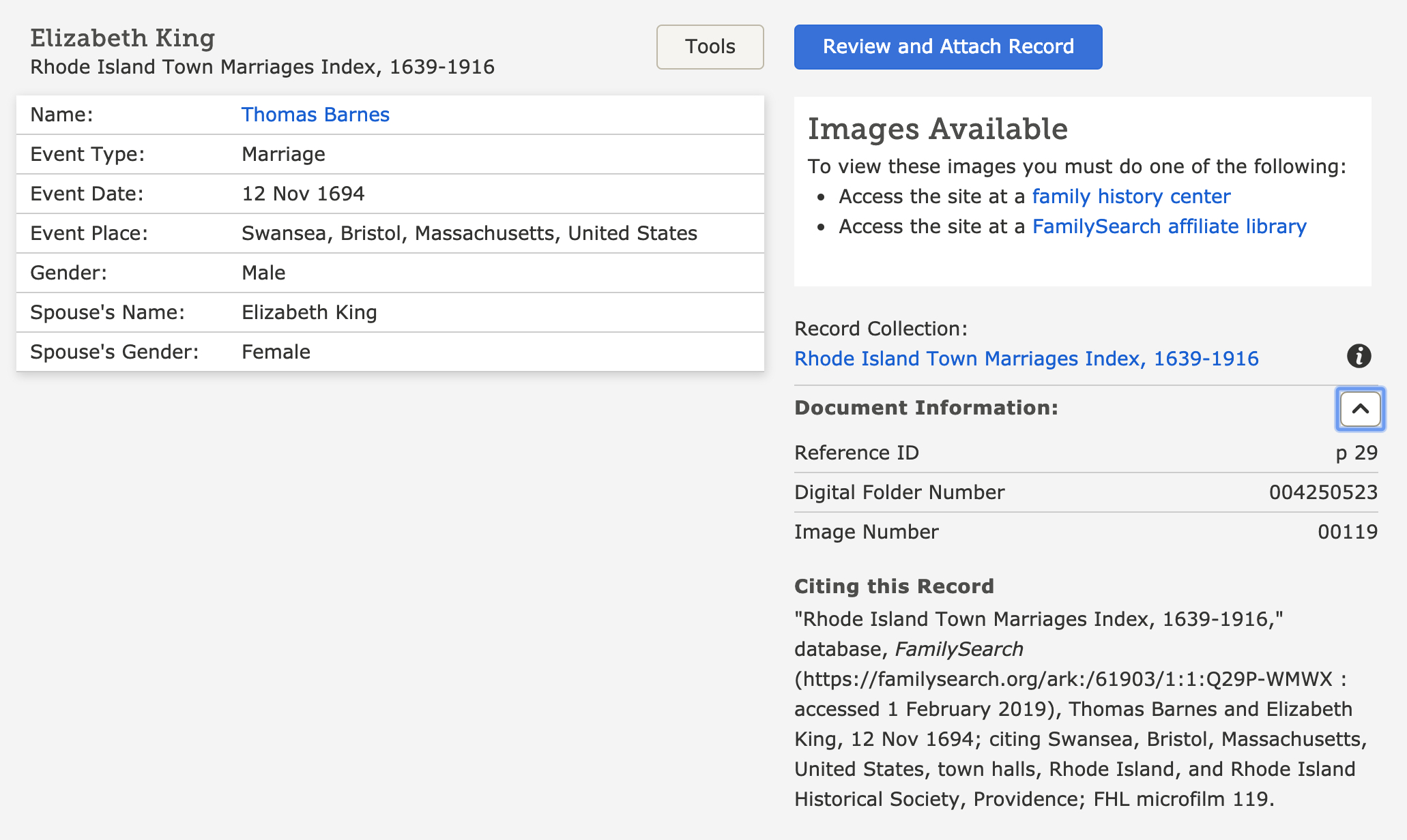"Rhode Island Town Marriages Index, 1639-1916," database, FamilySearch ( https://familysearch.org/ark:/61903/1:1:Q29P-WMWX : accessed 10 October 2017), Thomas Barnes and Elizabeth King, 12 Nov 1694; citing Swansea, Bristol, Massachusetts, United States, town halls, Rhode Island, and Rhode Island Historical Society, Providence; FHL microfilm 119.