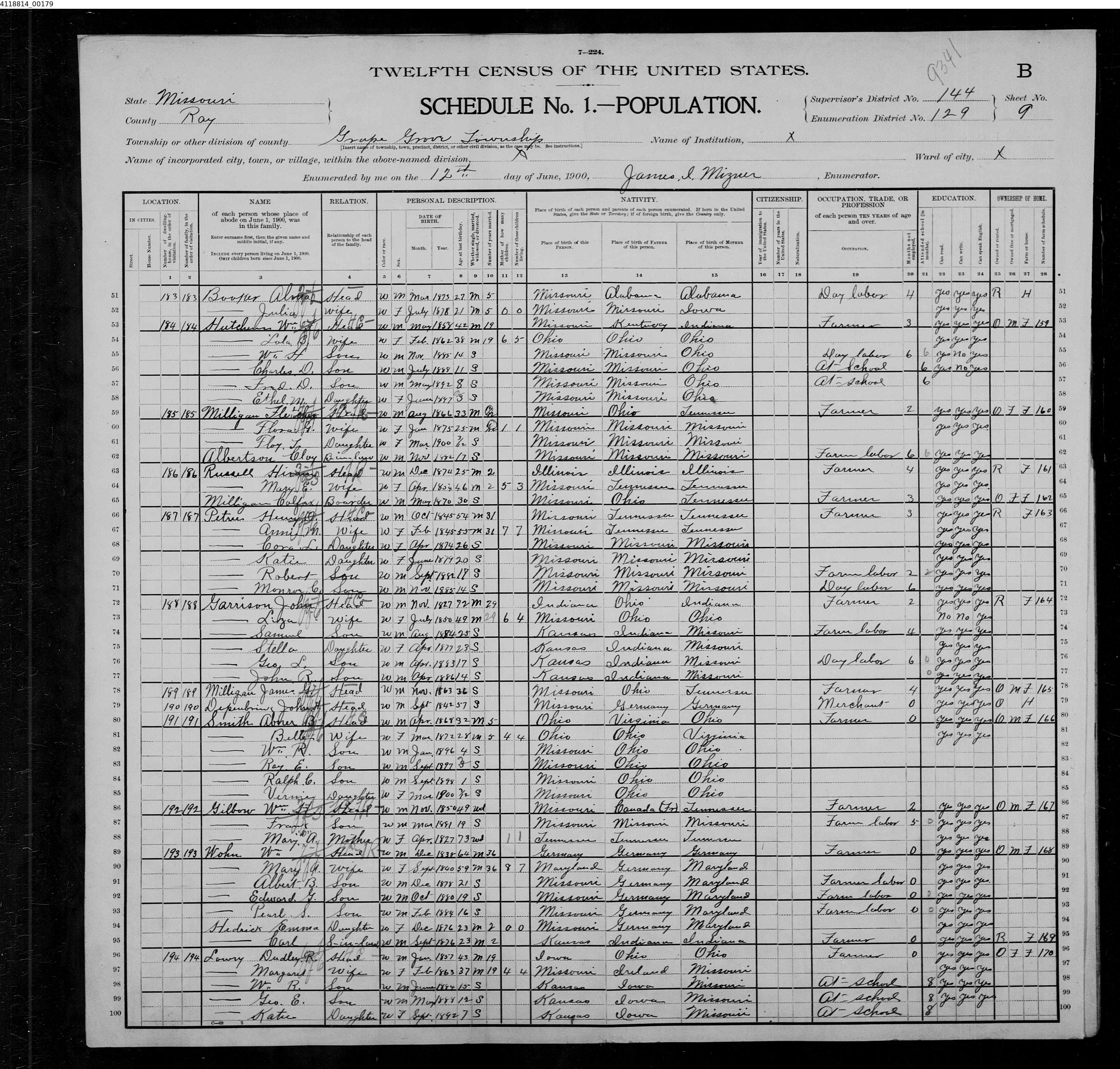 "United States Census, 1900," database with images, FamilySearch ( https://familysearch.org/ark:/61903/1:1:M388-NVN : accessed 9 December 2017), Dudley R Lowry, Grape Grove Township (north half), Ray, Missouri, United States; citing enumeration district (ED) 129, sheet 9B, family 194, NARA microfilm publication T623 (Washington, D.C.: National Archives and Records Administration, 1972.); FHL microfilm 1,240,885.