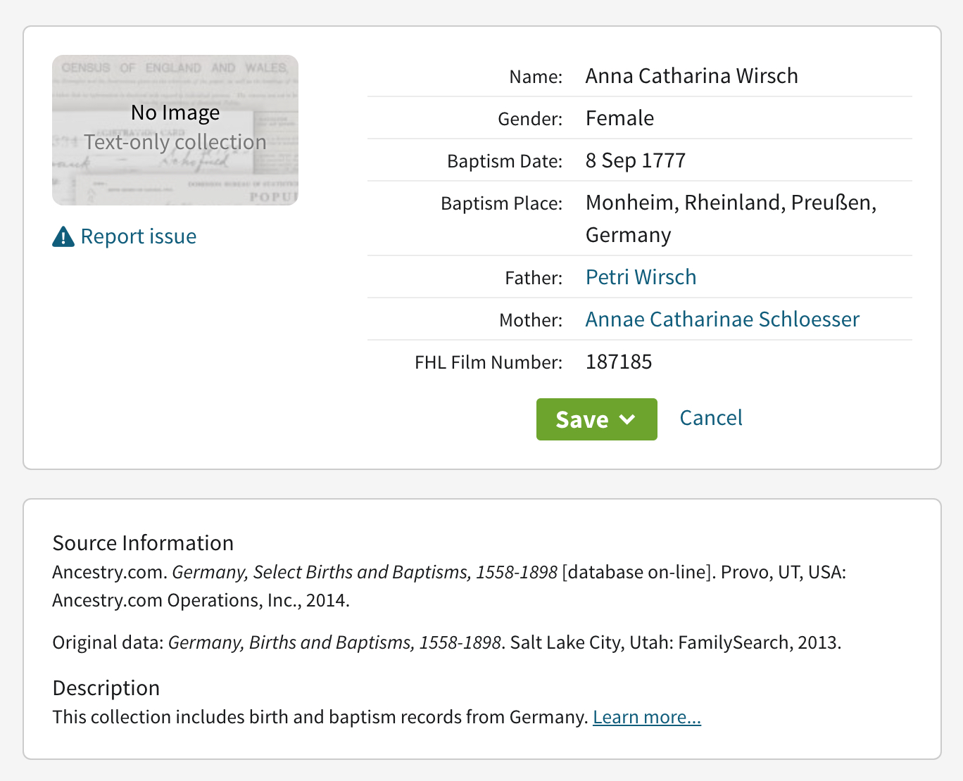 Ancestry.com. Germany, Select Births and Baptisms, 1558-1898 [database on-line]. Provo, UT, USA: Ancestry.com Operations, Inc., 2014.