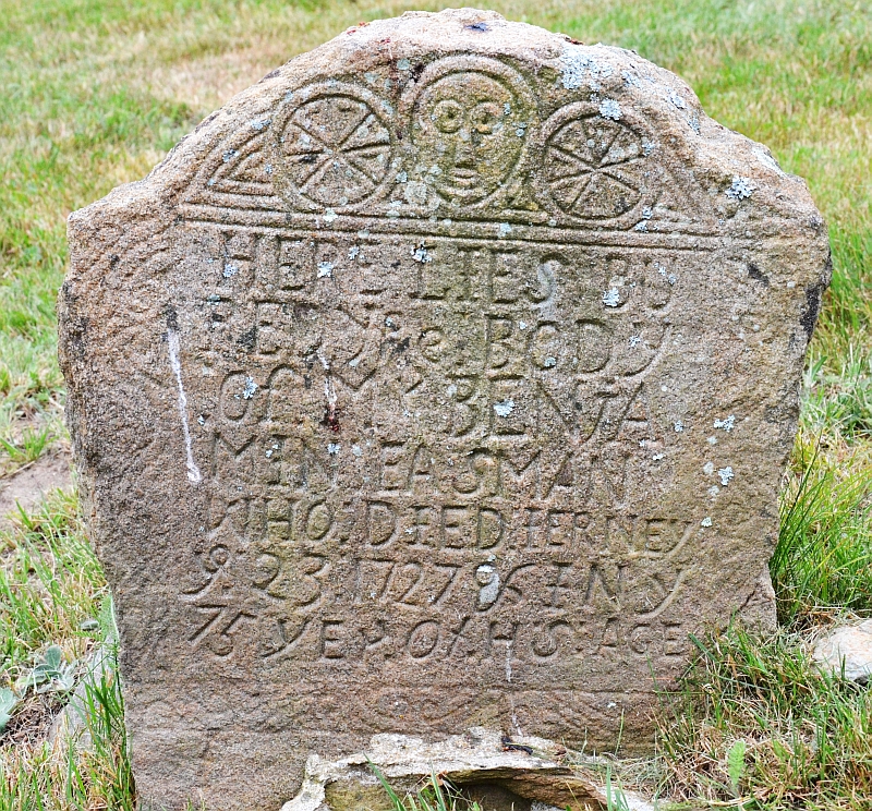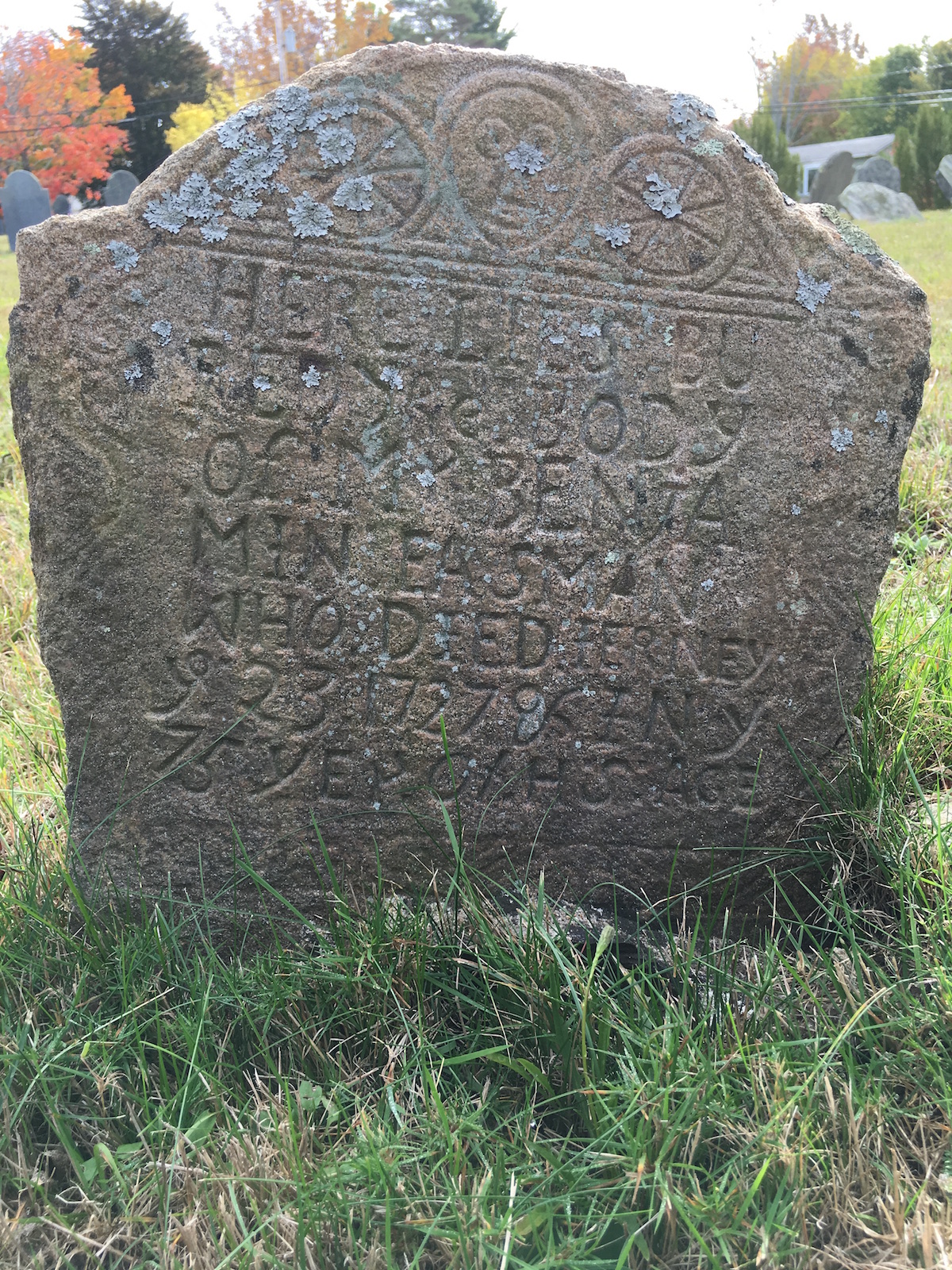 first person to be buried in yard∼Son of Roger Eastman and Sarah Smith. Married Ann Pitts 5 Apr 1678 Salisbury, Essex Co., Massachusetts.∼The Salisbury, MA records note that Benjamin Easman, the 7th son of Rodger and Sarah, was born on 12: 12: 1652 (Old Style dating) which would be 12 Feb 1653 in New Style dating. The marker is hard to read. It may say he "died here in y[e] 7: 23: 1727.8, which would be 23 Sep 1728 in today's reckoning, but I'm using the day 23 and year 1727 until further information can be found.