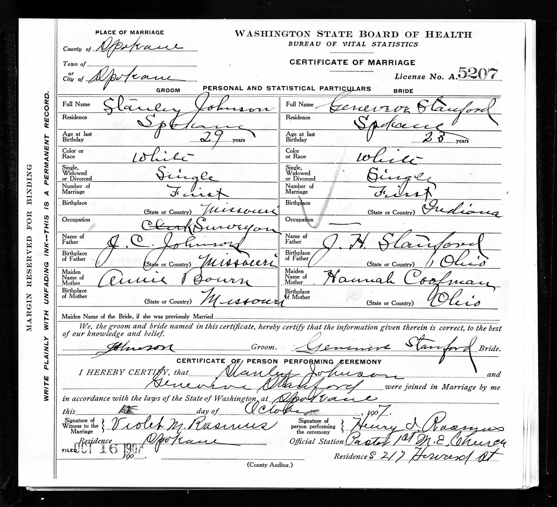William Johnson & Genevieve Stanford - Washington Marriage Record