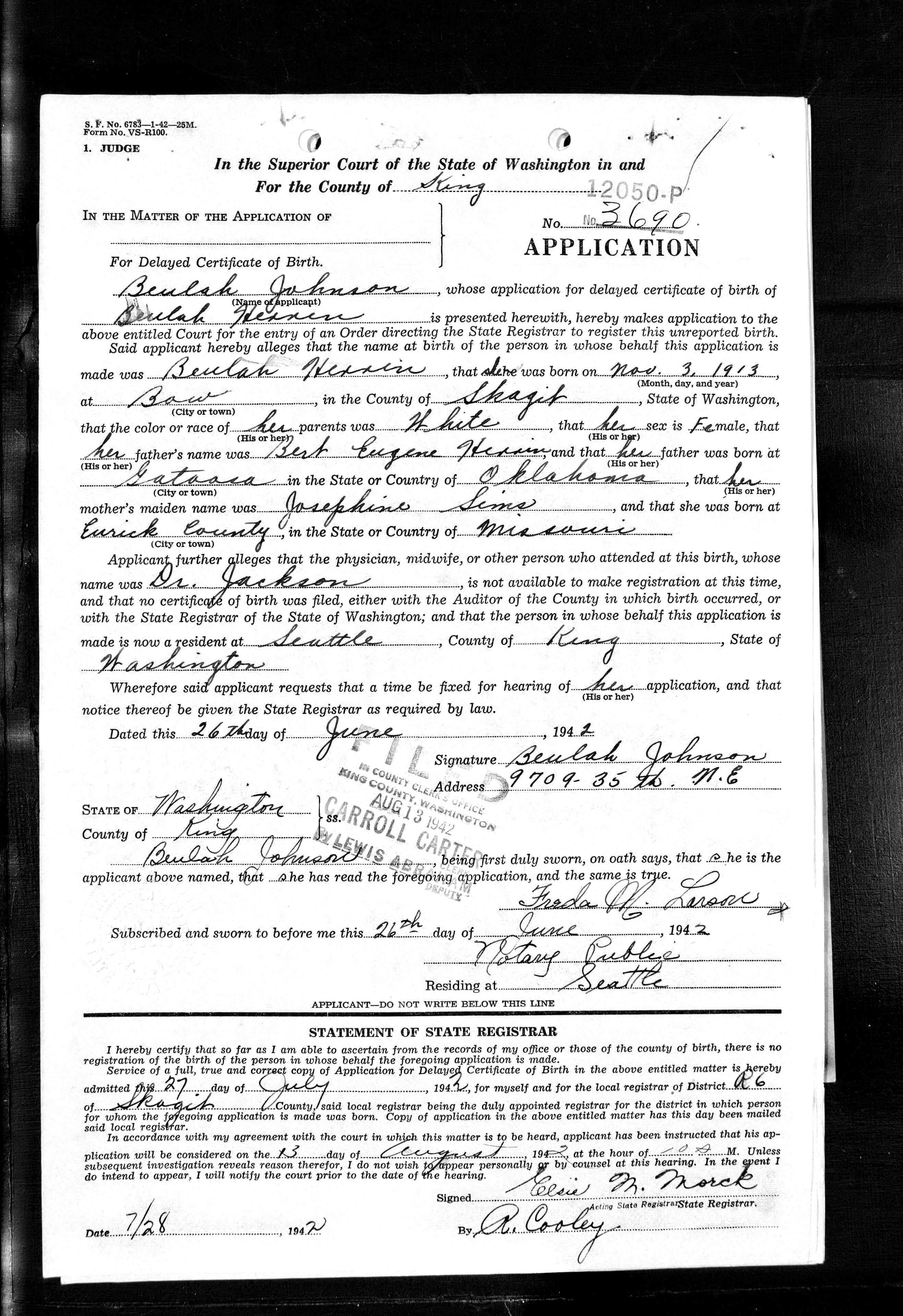 Beulah Herrin - Washington Delayed Birth Record