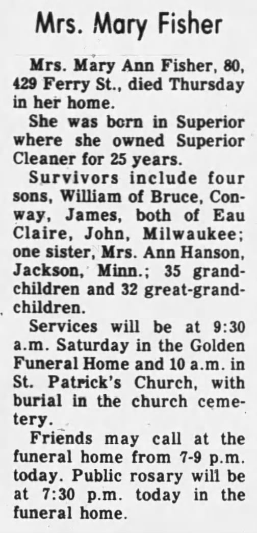 Daughter of John & Lucy Hemmelmann Schultenover, Mrs. Mary Ann Fisher, 80, 429 Ferry St., died Thursday in her home.