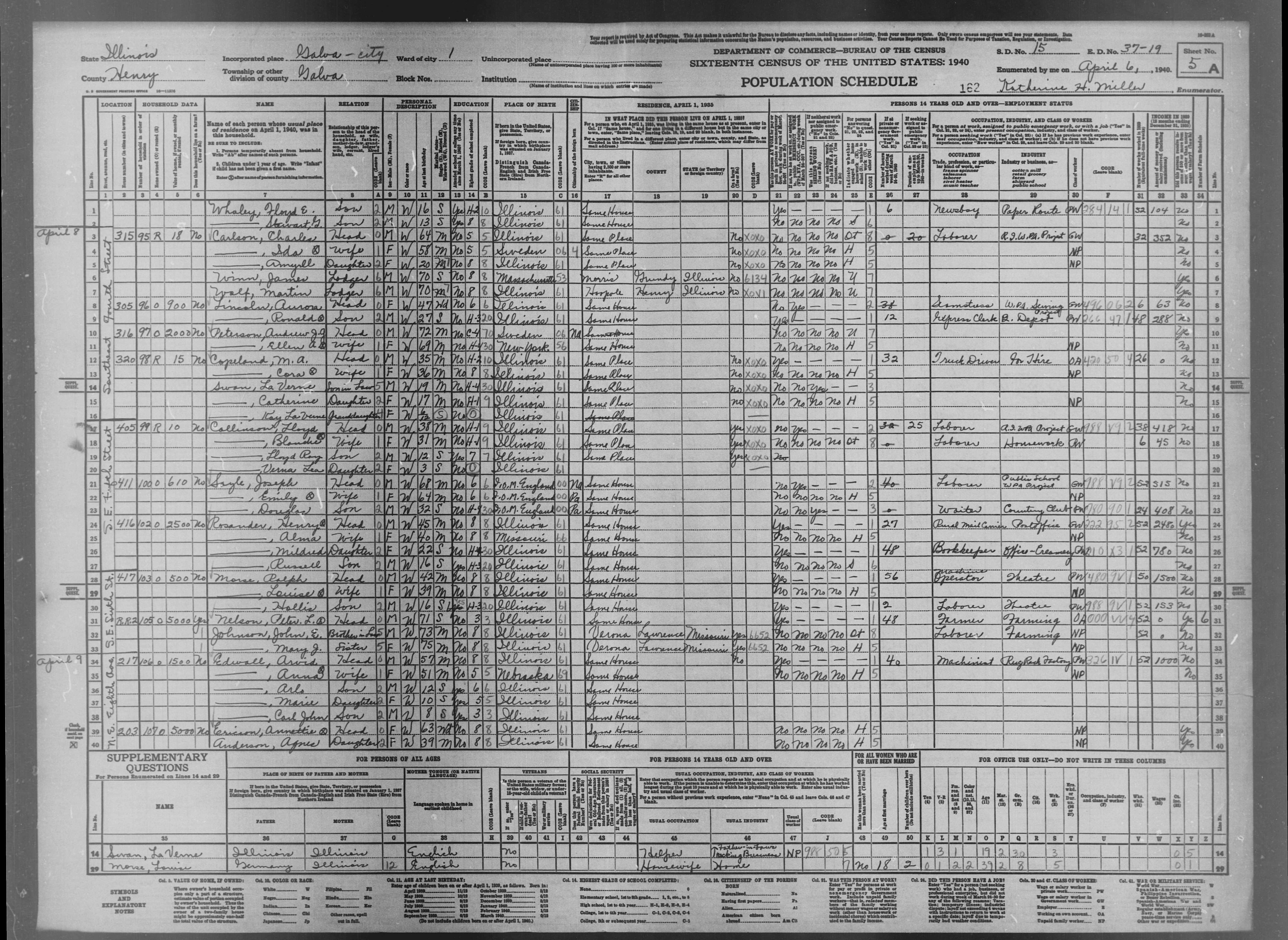 "United States Census, 1940," database with images, FamilySearch ( https://familysearch.org/ark:/61903/1:1:KWH4-R49 : 19 November 2019), Russell Rosander in household of Henry Rosander, Galva, Galva Township, Henry, Illinois, United States; citing enumeration district (ED) 37-19, sheet 5A, line 27, family 102, Sixteenth Census of the United States, 1940, NARA digital publication T627. Records of the Bureau of the Census, 1790 - 2007, RG 29. Washington, D.C.: National Archives and Records Administration, 2012, roll 811.
