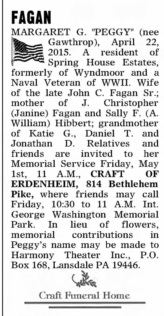 A resident of Spring House Estates, formerly of Wyndmoor and a Naval Veteran of WWII. Wife of the late John C. Fagan Sr.
