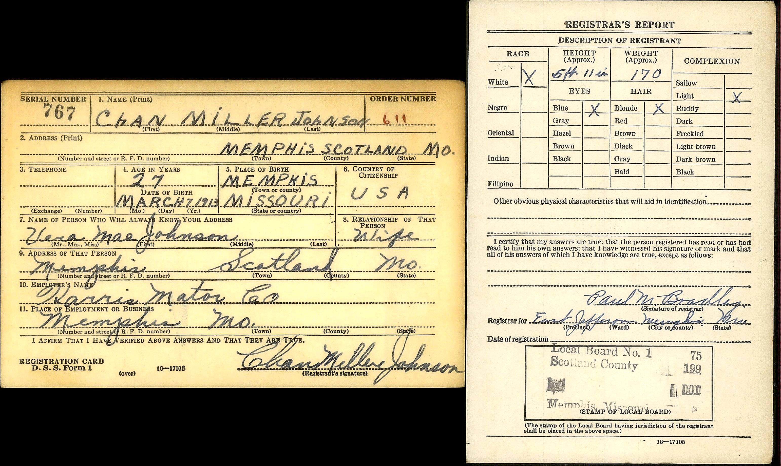 Chan Miller Johnson - World War II Draft Registration