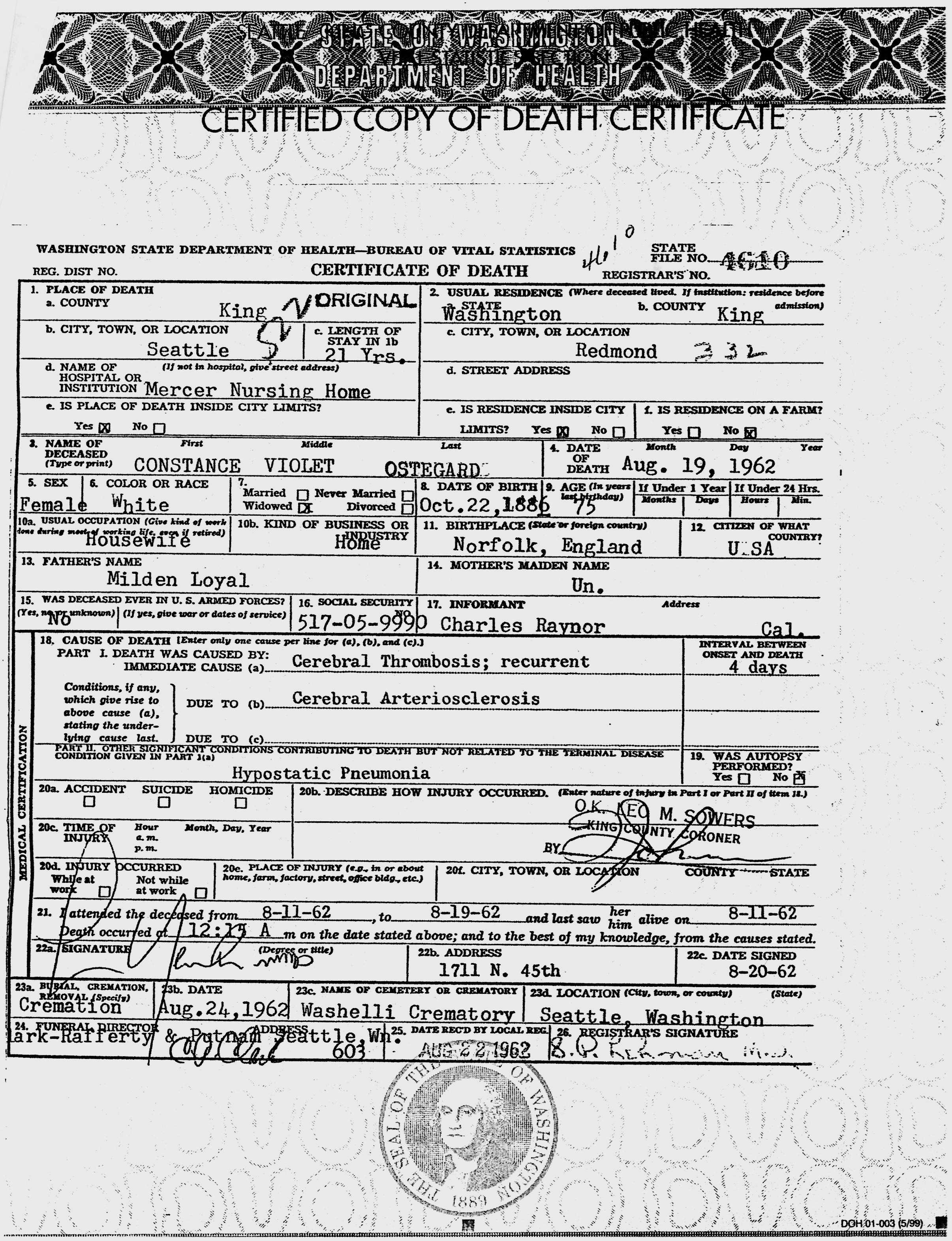 Violet Maxine Lloyd - Washington State Certificate of Death