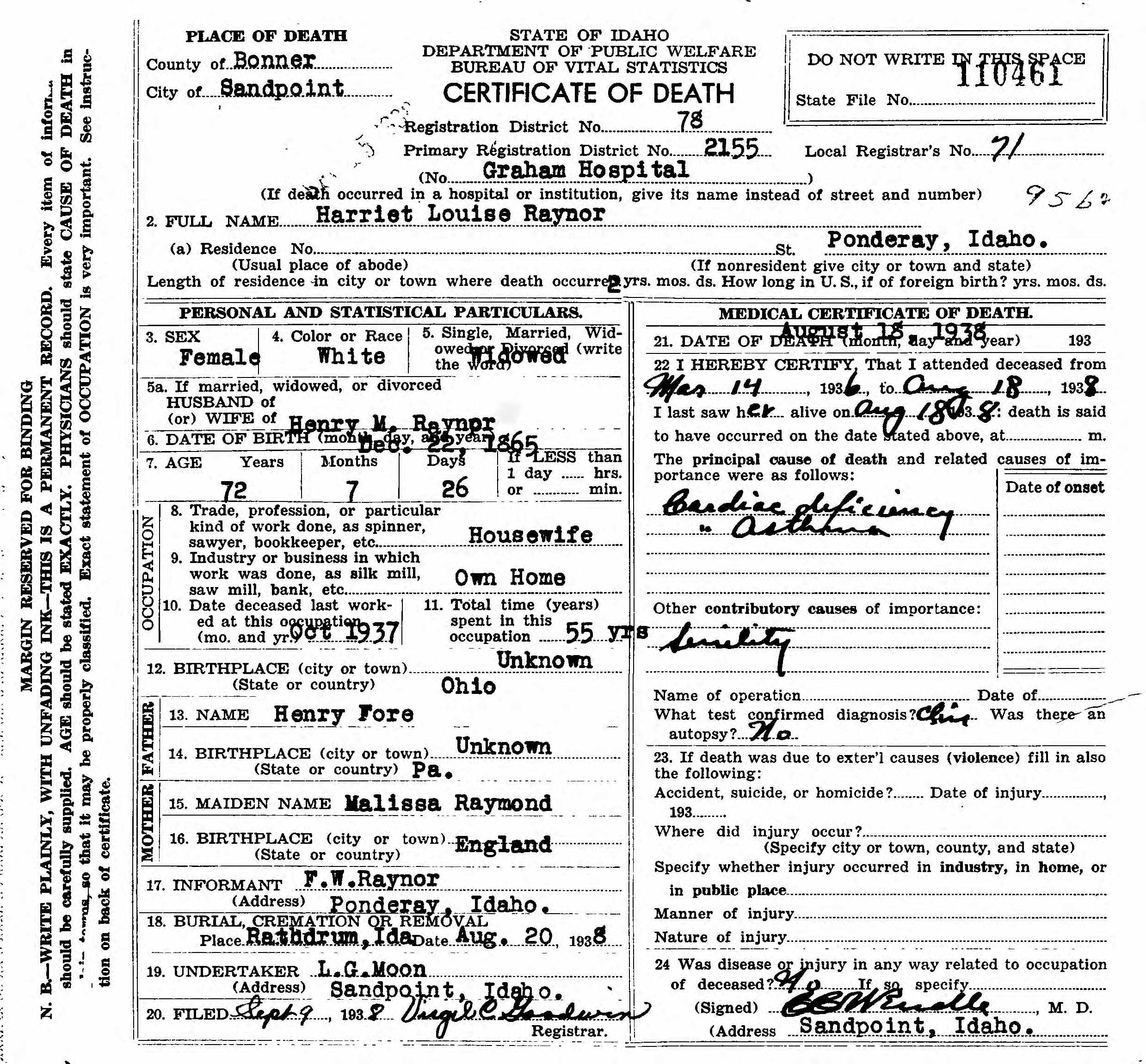Harriet Louise Raynor (Foland) - Idaho, U.S., Death Records, 1890-1971