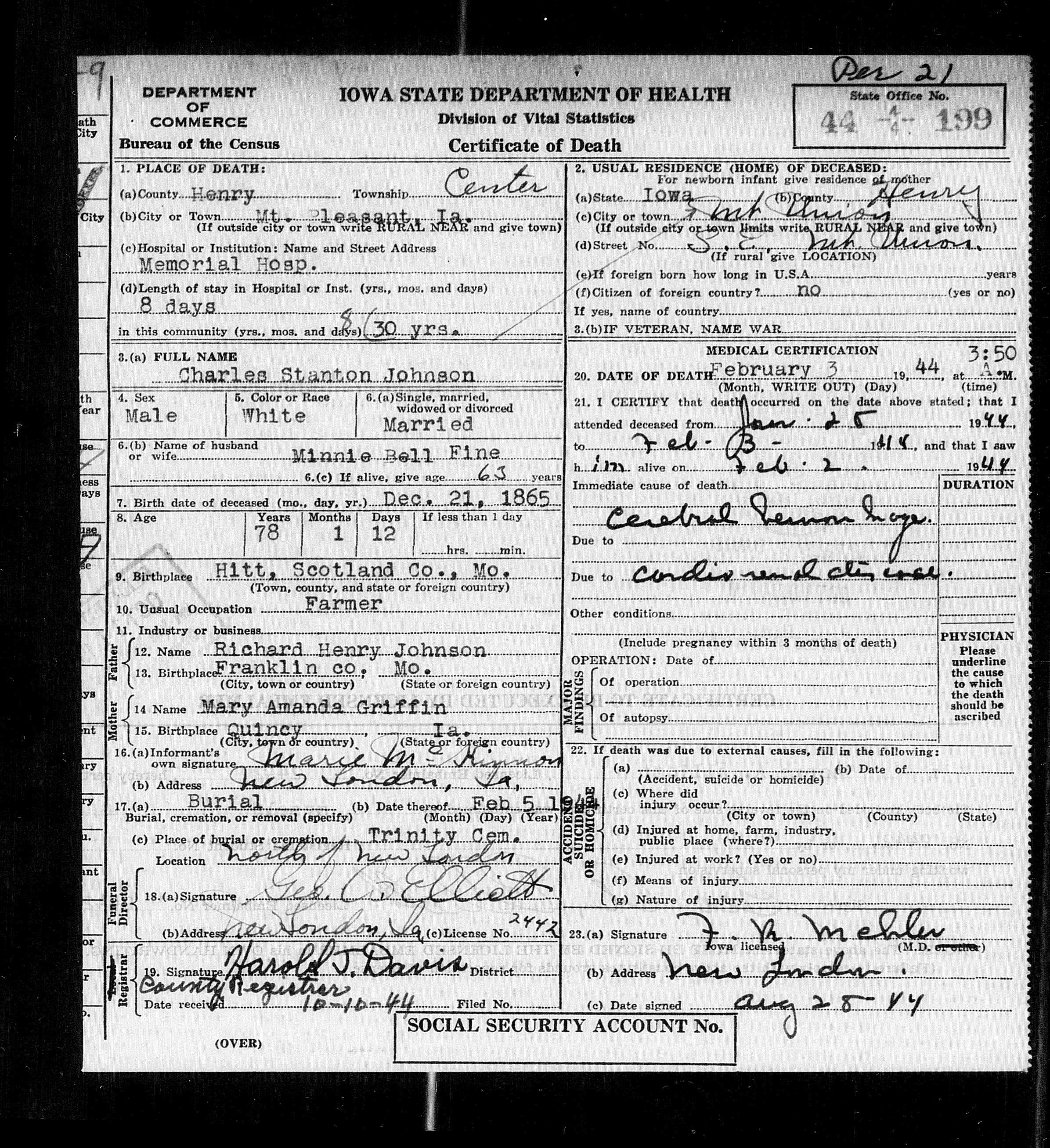Charles Stanton Johnson - Iowa, Death Records, 1904-1951