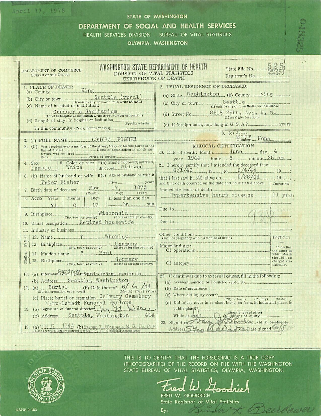 Louisa Wehrle - Washington Death Record