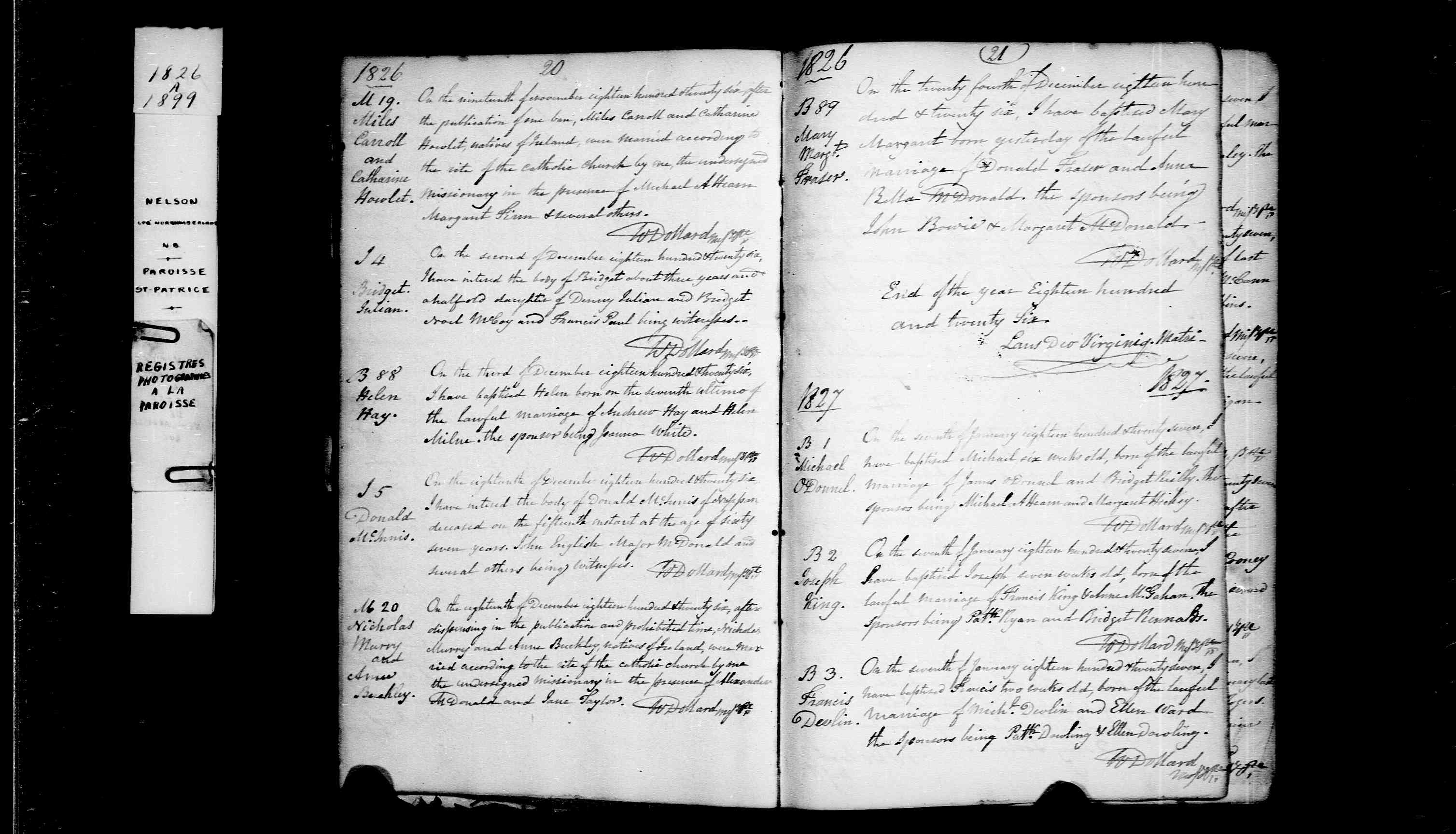 On the twenty fourth of December eighteen hundred twenty six, I have baptised Mary Margaret born yesterday of the (lofted?) marriage of Donald Fraser and Anna Bella McDonald, the sponsors being John Bowie and Margaret McDonald.