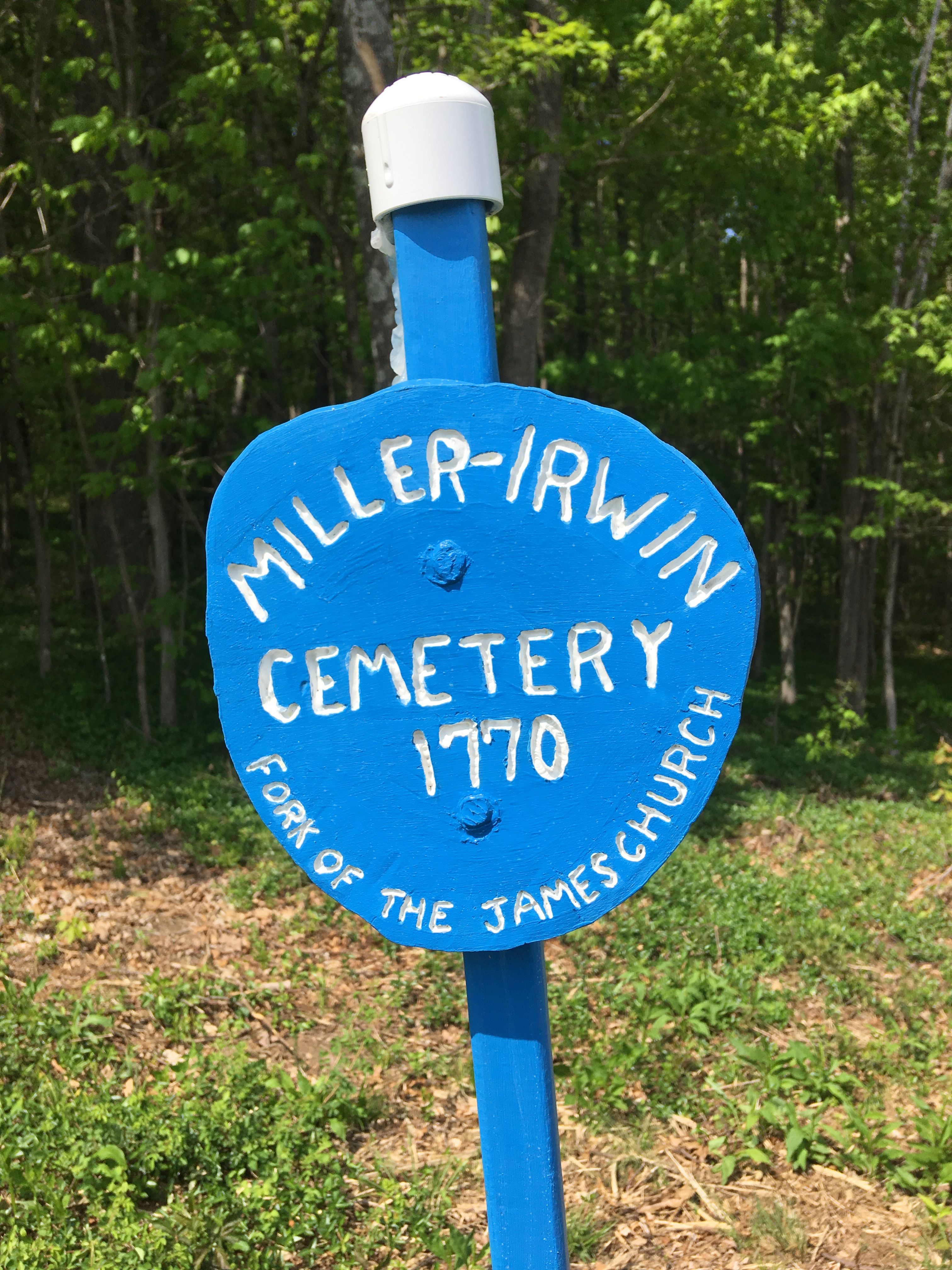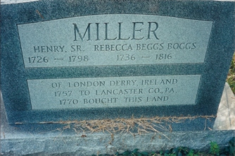Henry and Rebecca Boggs moved from Lancaster Co., PA to Botetourt Co. (now Rockbridge), VA. Here they received 400 acres in the Greenlee Grant. The farm was located 2.5 miles east of the Natural Bridge and 3 miles north of the James River. It was here on the eastern side of "Indian Road" that Henry erected a home. Also built on this land was the twelve (12) cornered church of the Associate Reformed Presbyterian faith known as The Fork of James Meeting House. They reared seven (7) children here. The homestead land that was remaining at the time of Henry's death was willed to son Samuel (3rd son). His will was proved October 1797. Henry, and later Rebecca, were buried in the little graveyard of the Fork of James Church. The original home and church are long gone. The cemetery was abandoned and neglected to the point of being overgrown and undetectable as a cemetery. In the 1980's it was re-discovered and cleared of brush and debris. Then called the Miller-Irwin Cemetery, a new memorial monument to the Millers was erected.