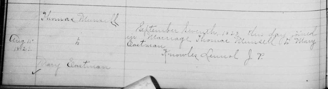 Thomas Munselle and Mary Eastman Old Marriage Record