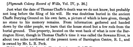 I Thomas Chaffee of Swansie in the Colony of New Plymouth in New England being of great age yet in my perfect memory and good understanding make this my Last Will and Testament, first I Comitt my soul to god in Jesus Christ my Redeemer and my body unto ye grave.