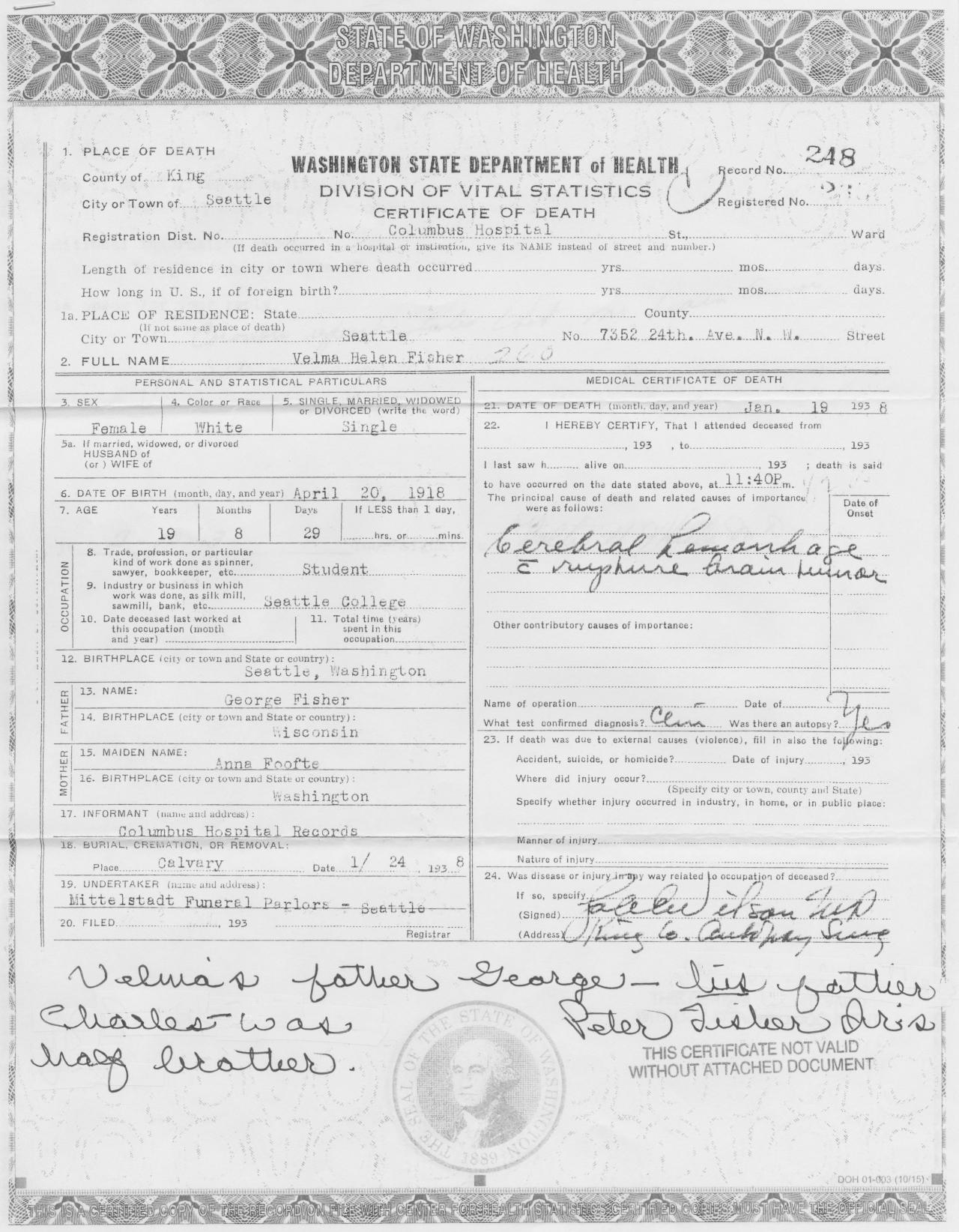 birth of childVelma Helen Fisher Seattle, King, Washington, USA ⇓ 1 Source ⇓ |