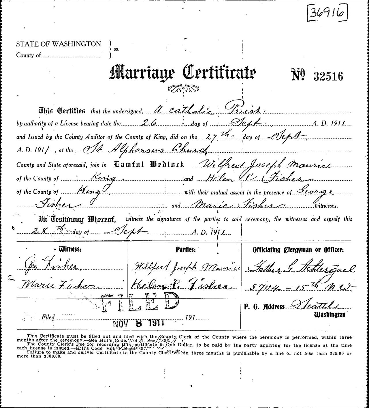 marriageWilfred Joseph Maurice Seattle, King, Washington, USA ⇓ Married at St. Alphonsus Church |