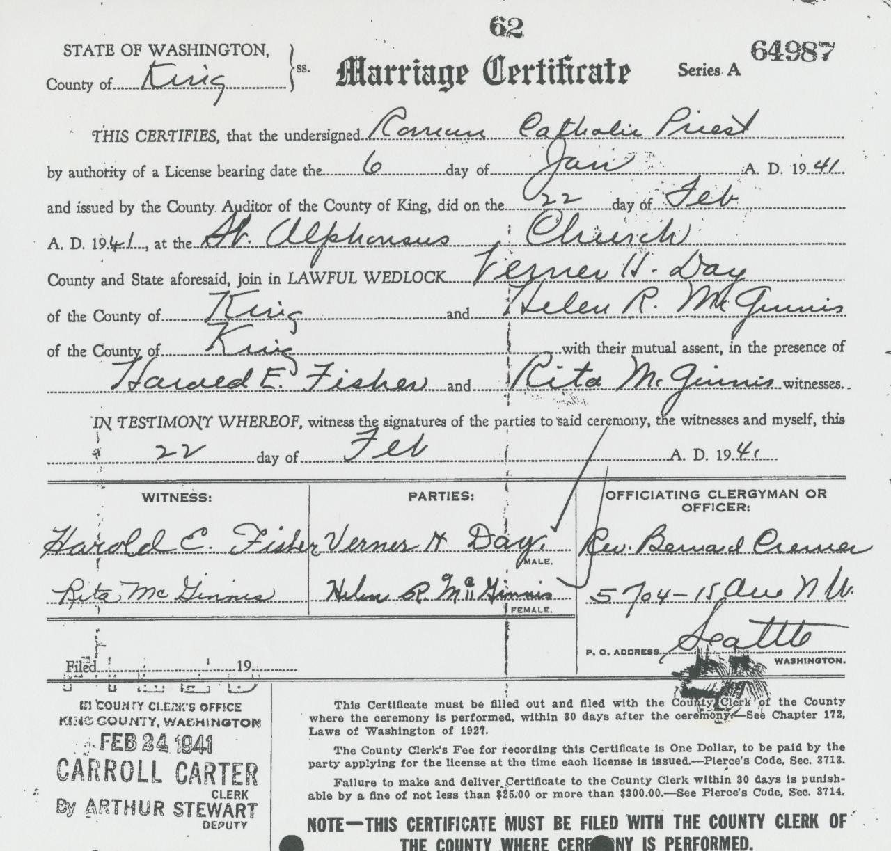 marriageVerner Harley Day Seattle, King, Washington, USA ⇓ 2 Sources ⇓ |