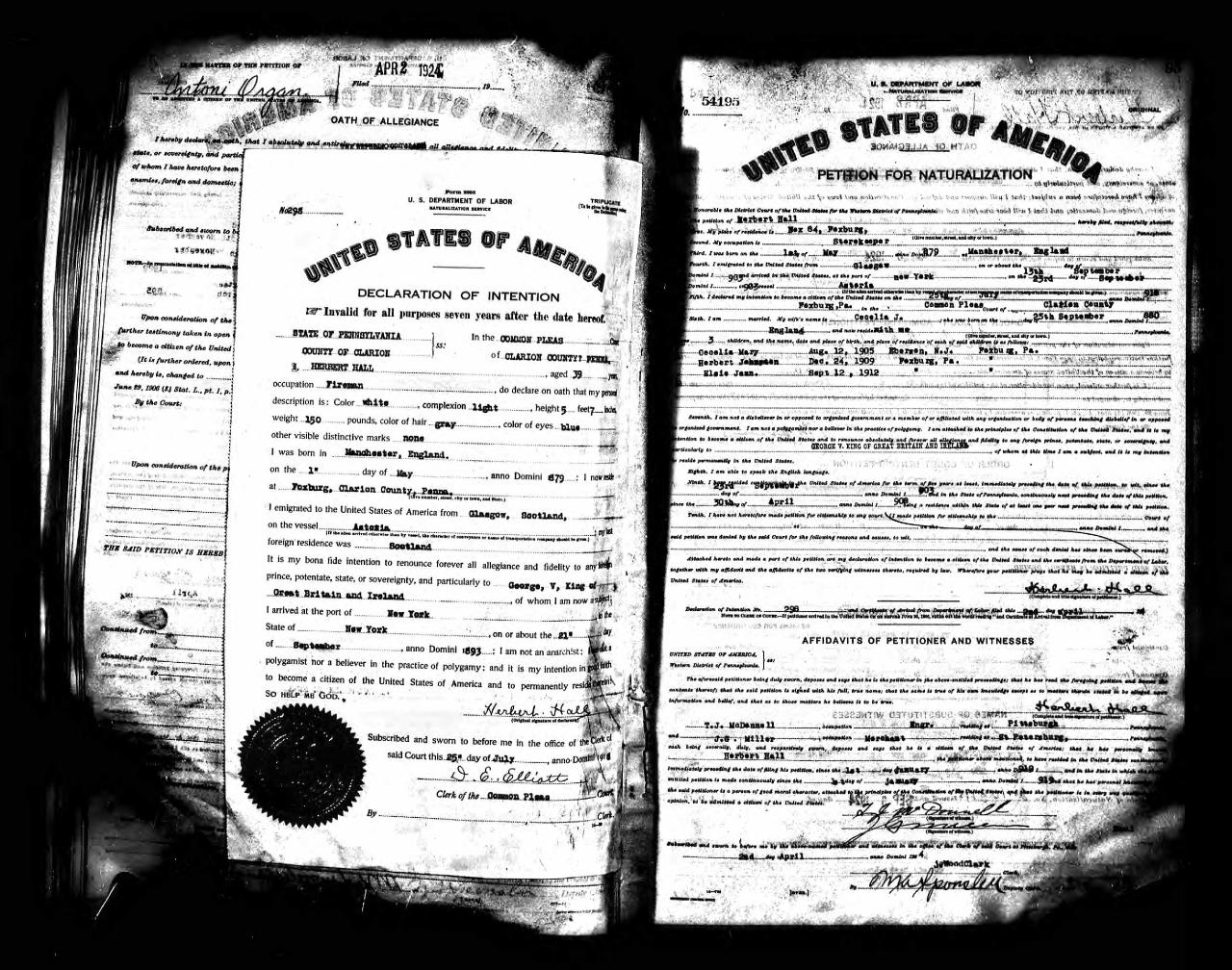 naturalizationClarion County, Pennsylvania, USA ⇓ Up until that point he had been a subject of George V of Great Britain and Ireland. His occupation is listed as fireman, as well as storekeeper. 1 Source ⇓ |