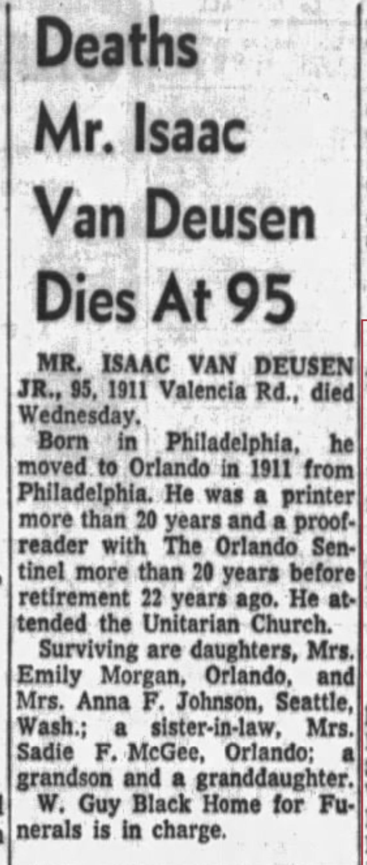 residenceConway, Orange, Florida, USA ⇓ Isaac Van Deusen Jr. and his wife Anna (Franklin) Van Deusen are living with his parents, Isaac Van Deusen Sr. and Josephine (Hicks) Van Deusen. Isaac Van Deusen Sr. is a farmer. 1 Source ⇓ |