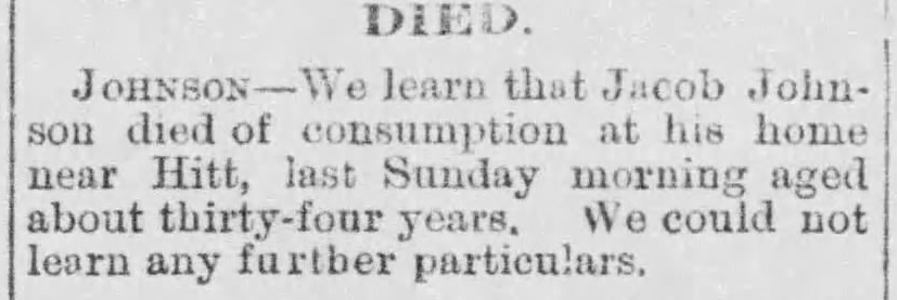 deathScotland County, Missouri, USA ⇓ Jacob died from tuberculosis 2 Sources ⇓ |