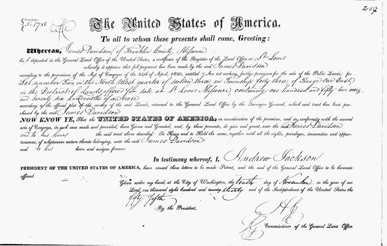 propertyFranklin, Missouri, USA ⇓ James Davidson purchased 152 acres - the document was signed by president Jackson. 1 Source ⇓ |