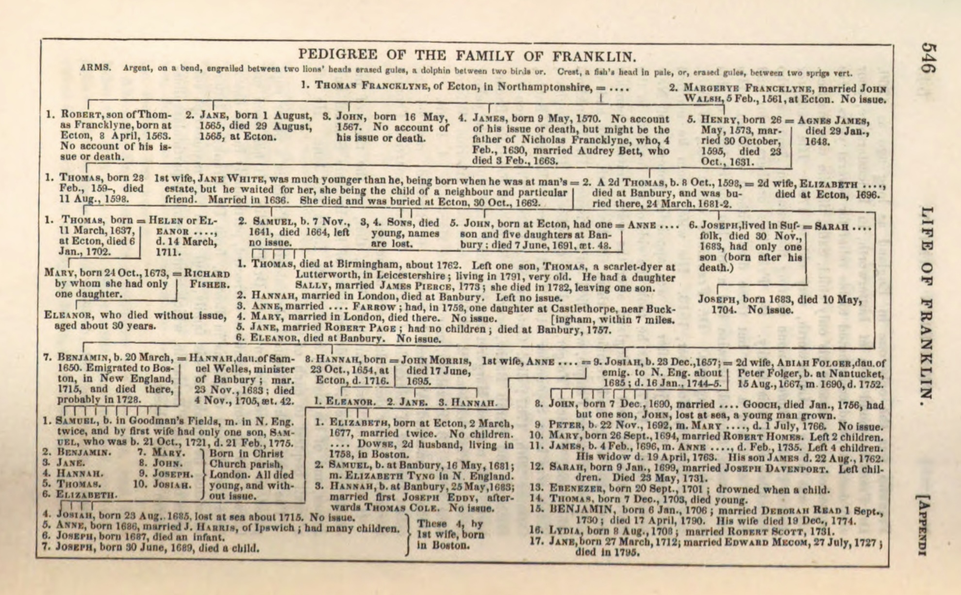 The Franklin family tree in this book give the family of Thomas Franklin and Jane White, as follows. Thomas, b.1637; Samuel b.1641; 2 sons who died young; John d.1691 age abt. 48; Joseph d. 1683; Benjamin b.1650; Hannah b.1654; Josiah b.1657. These are the 9 children of Thomas and Jane, and the total number of children that they had.