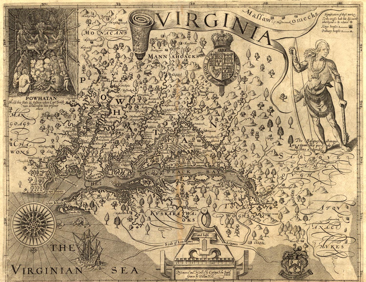 "This is an original map created in 1624 in London. The map shows Virginia, as described by Captain Smith in the year 1606. The map shows incredible details of the region, including settlements, terrain, and the location of Indians. Also, it includes a fascinating inset illustration of the famous Indian King, Powhatan. It includes a portrait of another Indian as well."
