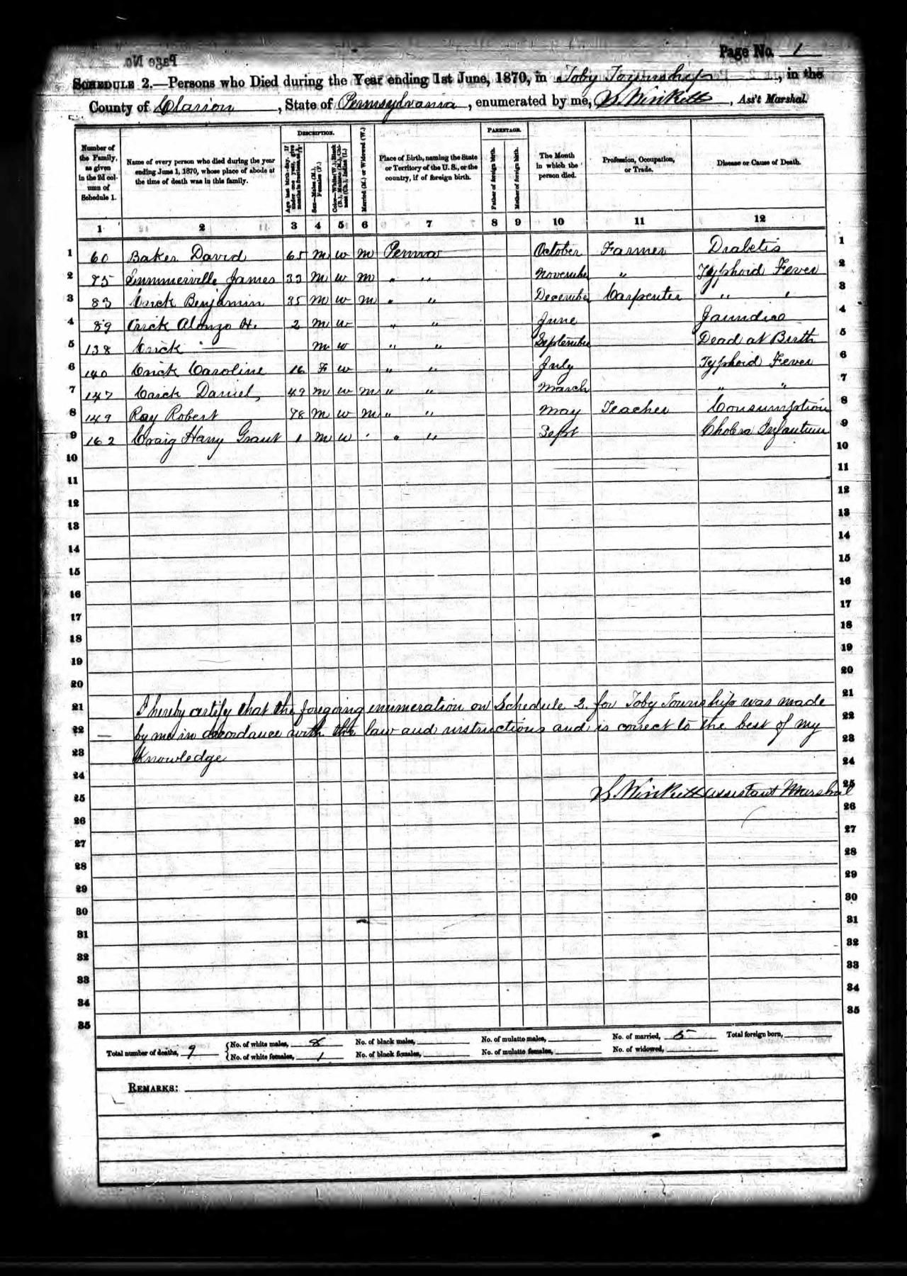 deathToby, Clarion, Pennsylvania, USA ⇓ Of typhoid fever. 1 Source ⇓ |