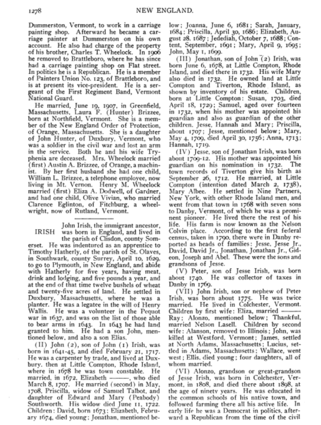 residenceDanby, Vermont, USA ⇓ Jesse and Mary Irish left from Nine Partners, New York, with their seven sons, including John, to make a new home at Danby. Jesse became a prominent pioneer, and his farm later became known as the Nelson-Colvin Place. 1 Source ⇓ |