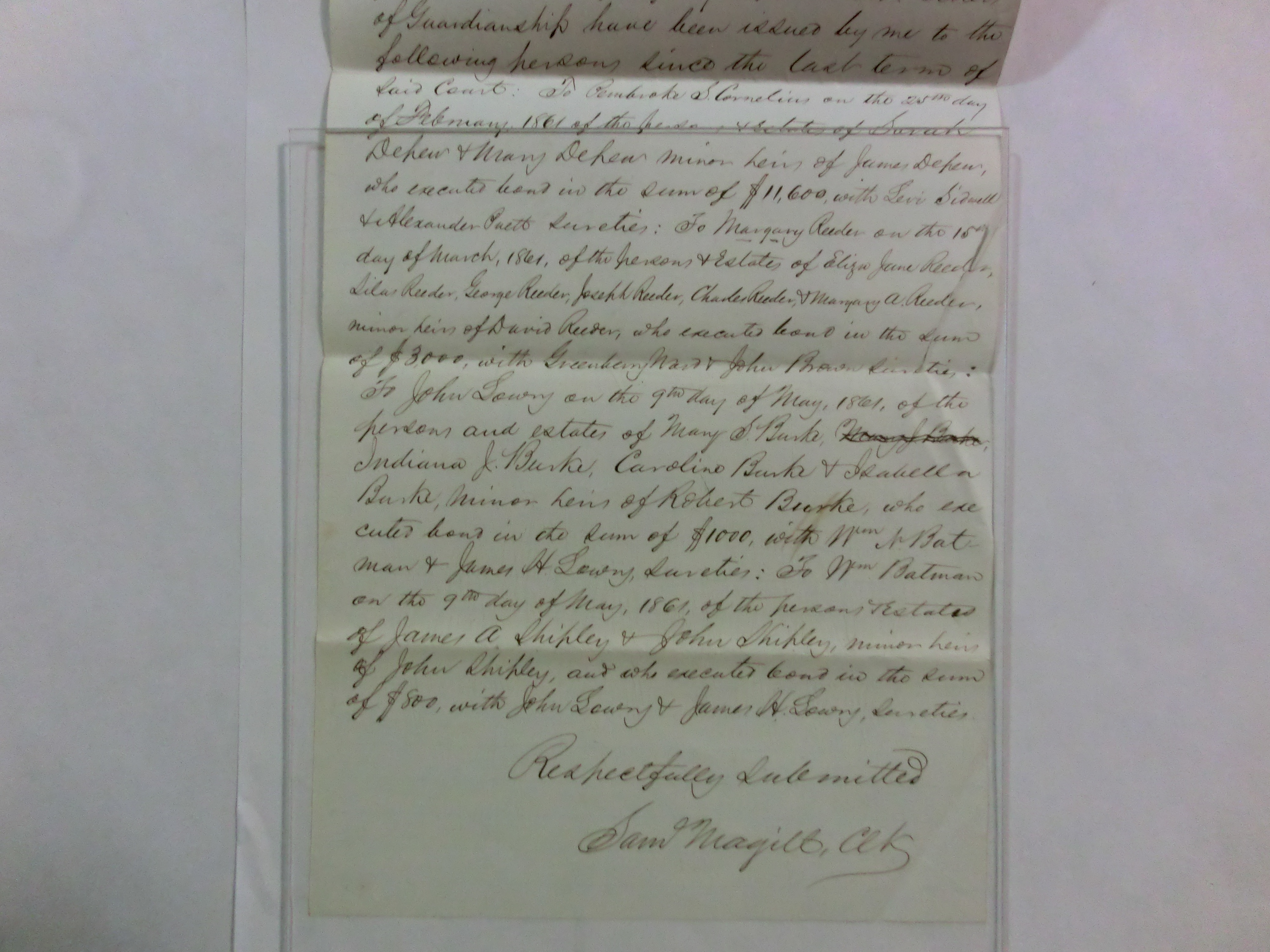 ...of Guardianship have been issued by me to the following persons lived the (?) terms of said court. To Pembroke S. Cornelius on the 25th day of February 1861 of the …. of Sarah (Depew?) and Mary Depew minor heirs of James Depew the executor bond in the sum of $11,600 with Levi Sidwell and Alexander Puett sureties: To Margary Reeder on the 15th day of March, 1861, of there persons and estate of Eliza Jane Reeder, Silas Reeder, George Reeder, Joseph W Reeder, Charles Reeder, and Margary A Reeder, minor heirs of said Reeder, the executor bond in the sum of $3000 with Greenberry Ward and John (Phaser?) sureties: Of John Lowry on the 9th day of May, 1861, of the persons and estates of Mary S. Burke, (Mary J. Burke crossed out), Indiana J. Burke, Caroline Burke and Isabella Burke, minor heirs of Robert Burke, who one (?) bond in the sum of $1000, with Wm N Batman and James H Lowry, sureties: To Wm Batman on the 9th day of May, 1861, of there persons estates of James A Shipley and John Shipley, minor heirs of John Shipley, and who executed bond in the sum of $800, with John Lowry and James H Lowry, sureties.