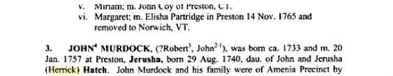 ...by June 1763 and he was taxed there through 1778. His fann was noted in a deed of 2 Sept. 1780 for land in lot 35 in Amenia that John Bamet was selling to Peletiah Mills of Colebrook, CT. He signed the AofA in Amenia, DC. John Murdock died 9 March 1787. age 54. Letters of Administration were granted to Zimri Murdock of Amenia