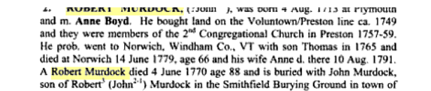 A Robert Murdock died 4 June 1770 age 88 and is buried with John Murdock, son of Roberts (John2") Murdock in the Smithfield Burying Ground in town of Amenia, DC. We think it probable that it is this man and the gravestone has been misread (continued in next snippet)...