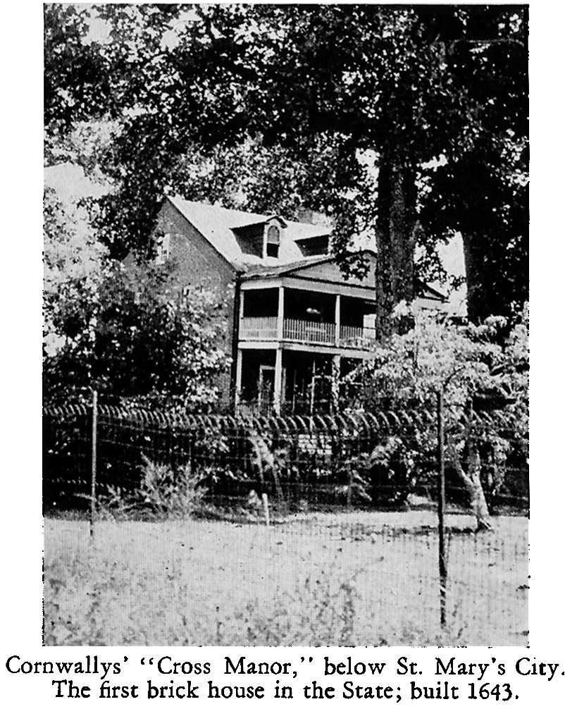 "The old house at Cross Manor has been called the oldest house in Maryland, sometimes the oldest brick house in Maryland. Those claims are based on the belief that it was built in 1642-3 by Thomas Cornwaleys (variously spelled Cornwallys, Cornwallis and Cornwales), a Catholic recrusant who came to Maryland on the Ark in 1634 and has been called the Miles Standish of Maryland for his military prowess. Charles Duvall's 1943 photo below is of the side of the house that faces St. Inigoes Creek, a branch of the St. Mary's River. "