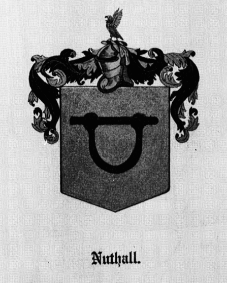 Nuthall Coat of arms: Cattenal Co. Chester, England. Argent, shackbolt, sable. Crest: a falcon rising, argent, ducally gorged or.
