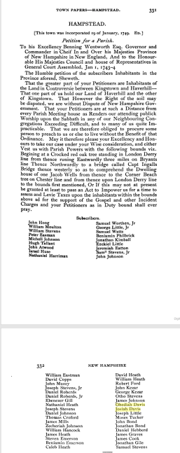 residenceHampstead, Rockingham, New Hampshire, USA ⇓ Josiah Davis and Obediah Davis signed a petition for a parish together, along with Otho Stevens. The two brothers lived near the eastern shores of Wash Pond, which was home to several pioneer families. It's described that Josiah Davis "(it is supposed) followed the "twelve rod way" tract from the Davis land at East Haverhill to the land near the eastern shore of the Wash pond." 3 Sources ⇓ |