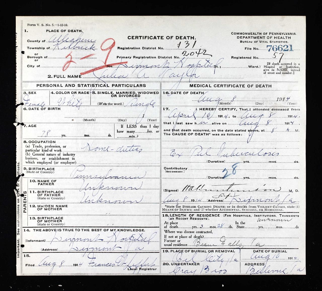 deathPittsburgh, Allegheny County Pennsylvania, USA ⇓ Her name is written as Julia 'A' Taylor. She had only lived in Allegheny for three years, which would make sense if she moved there from Mahoning. 2 Sources ⇓ |