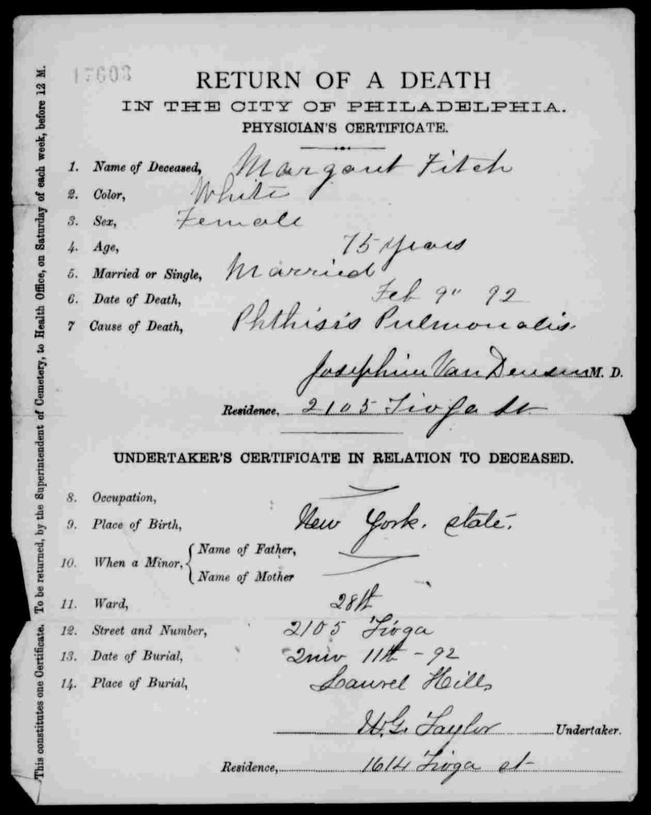 deathPhiladelphia, Pennsylvania, USA ⇓ Buried in the South Laurel Hill Cemetery in the Van Deusen lot. 2 Sources ⇓ |