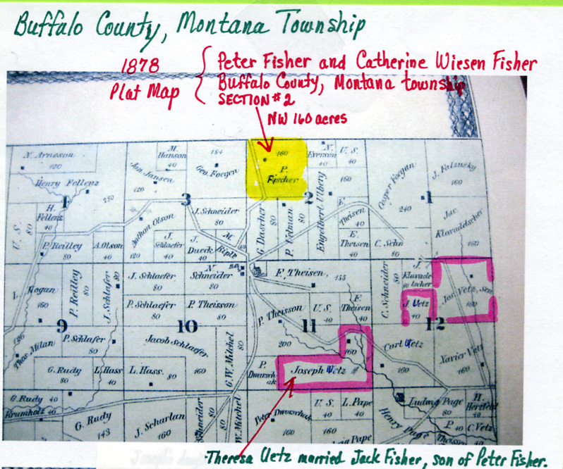 Peter and Katherine (Wiesen) Fisher owned 160 acres in the Northwest corner of Section #2, Montana Township, Buffalo County, Wisconsin. This is where they lived when the 1880 census was taken, but since this plat map was made in 1878, they moved to Buffalo County (from their homestead property in Portage County) by 1878.