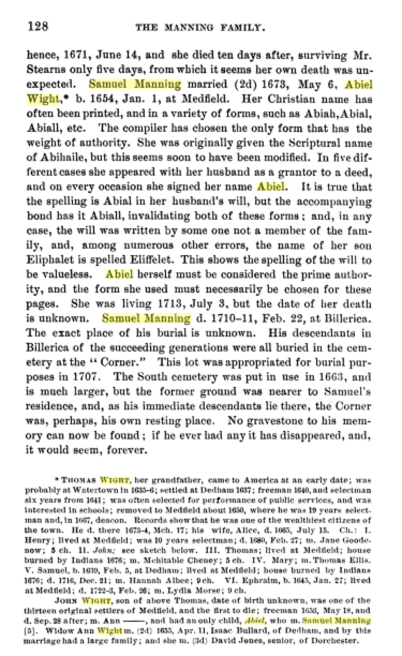Samuel Manning was a town clerk for six years, a selectman for nine years, and a deputy to the General Court from 1695-6. Him and his wife had twelve children.
