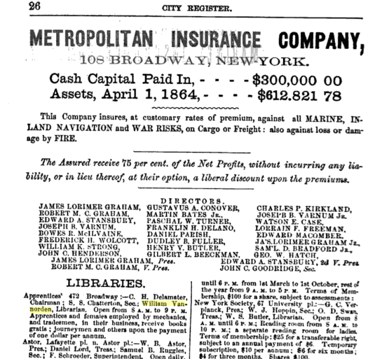 William Van Norden was a librarian, him and Sarah living with their daughter Sarah and her husband Alexander Morris. Their other daughter Elizabeth is also living there. The image is from a city directory around the time; it shows which library William worked at, the Apprentices' Library, est. 1820.
